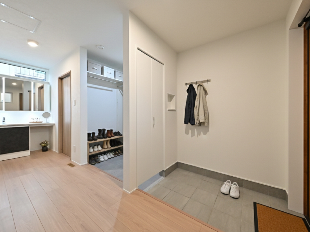 玄関、シューズクロークは広々としたスペースを確保し、使いやすさを追求した設計です。さらにホールにはワイドな洗面を配置し、のびのびと使える快適な空間に仕上げています。