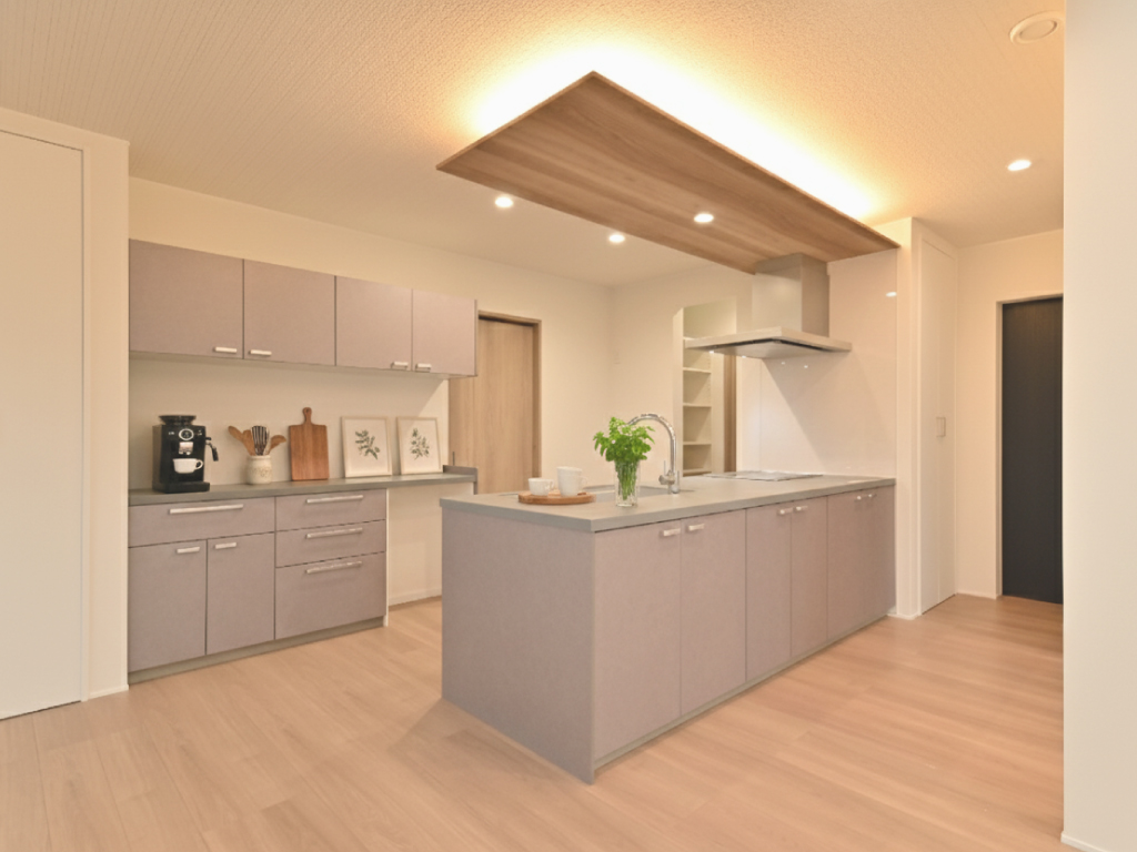 木目調の下がり天井に間接照明を加え、温かみのある広がりを感じる心地よいキッチン空間です。低めの吊戸棚は機能面をしっかり押さえつつ、上部に空間を作ることで圧迫感を感じさせません。