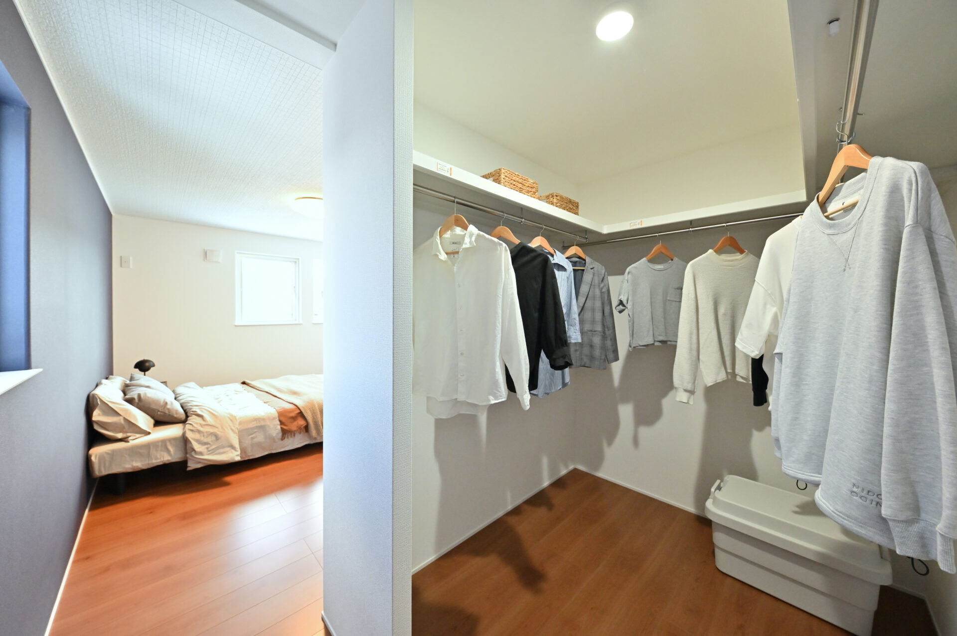 寝室のすぐ隣にあるから、着替えも片付けも流れるように完結。たっぷりの収納力が、慌ただしい朝に「余裕」というご褒美を届けてくれます。