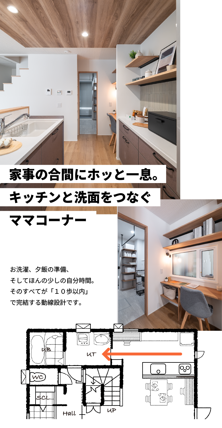 キッチン横にはワークスペースを完備。ちょっとした作業や子どものスタディーコーナーとしても使えます。ユーティリティーへの行き来がしやすいよう水まわり動線にもこだわりました。