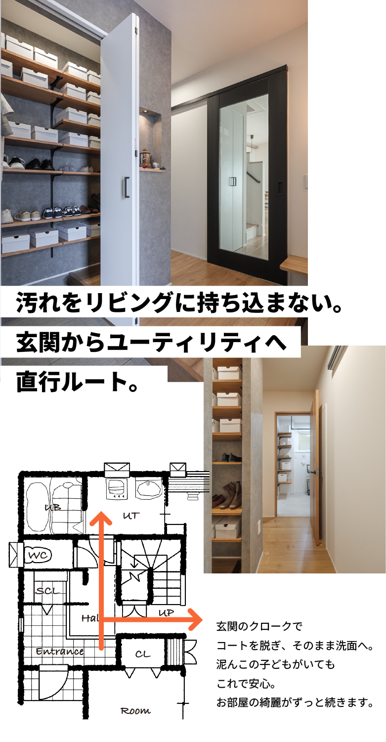 家族を迎える大切な玄関。リビングにもユーティリティーにもアクセスできる設計で、帰宅後も無駄のない動線が日々の生活をもっと快適に。シューズクロークにはみんなのアイテムをすっきりと収納でき、常にきれいに保てます。