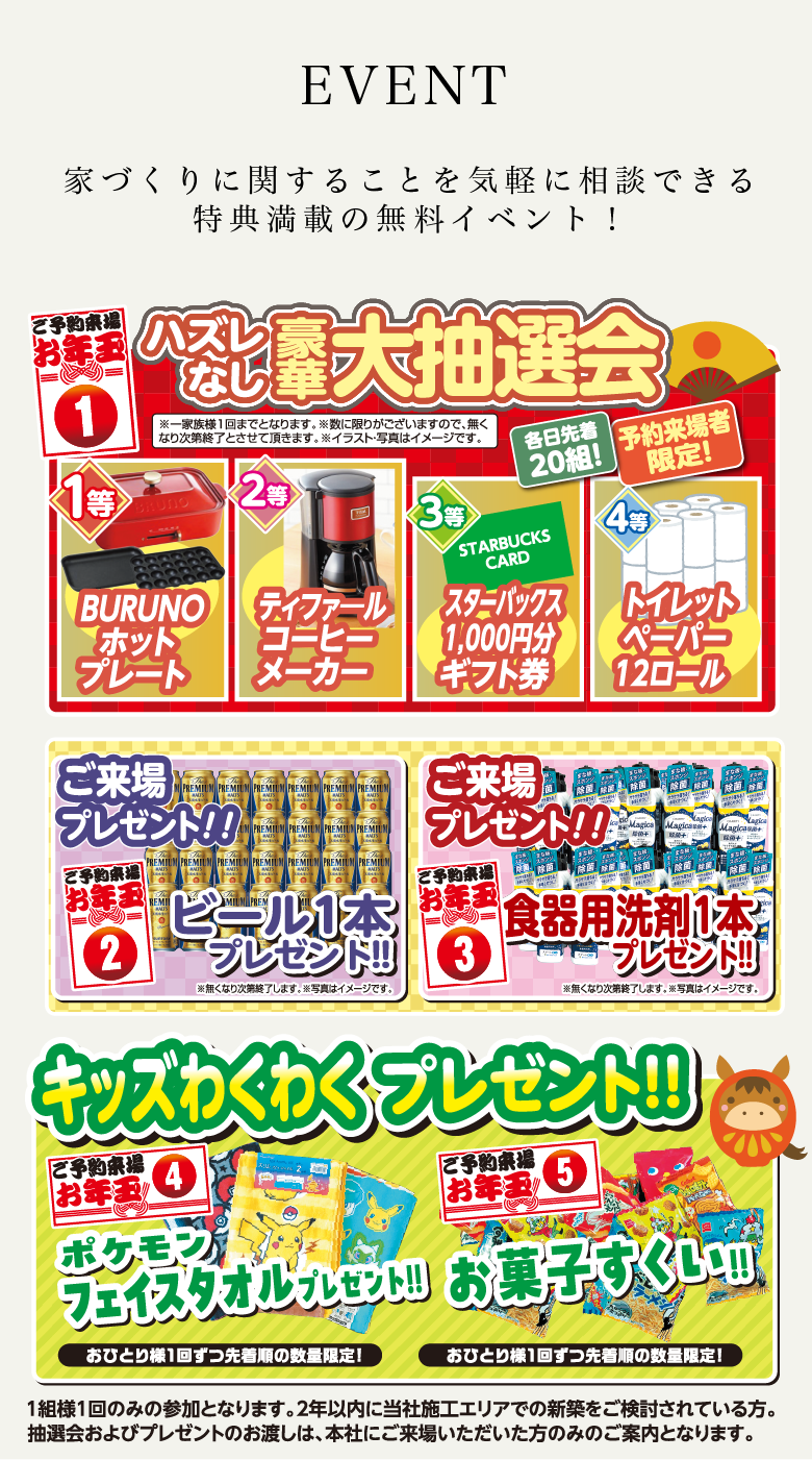 | 備考 | <事前予約制> HPより事前のご予約で特典に参加できます。 抽選会およびプレゼントのお渡しは、本社にご来場いただいた方のみのご案内となります。ご了承ください。 | ||