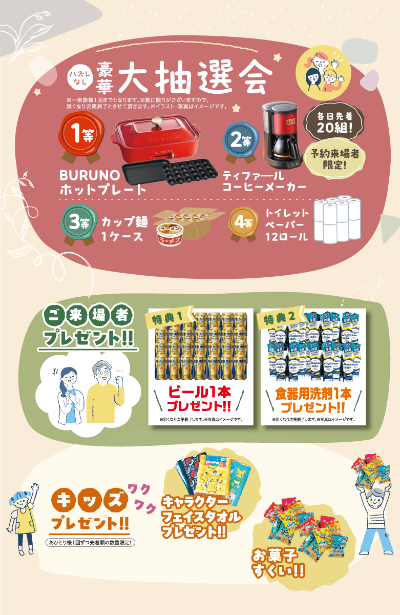 | 備考 | <事前予約制> HPより事前のご予約で特典に参加できます。 抽選会およびプレゼントのお渡しは、本社にご来場いただいた方のみのご案内となります。ご了承ください。 |